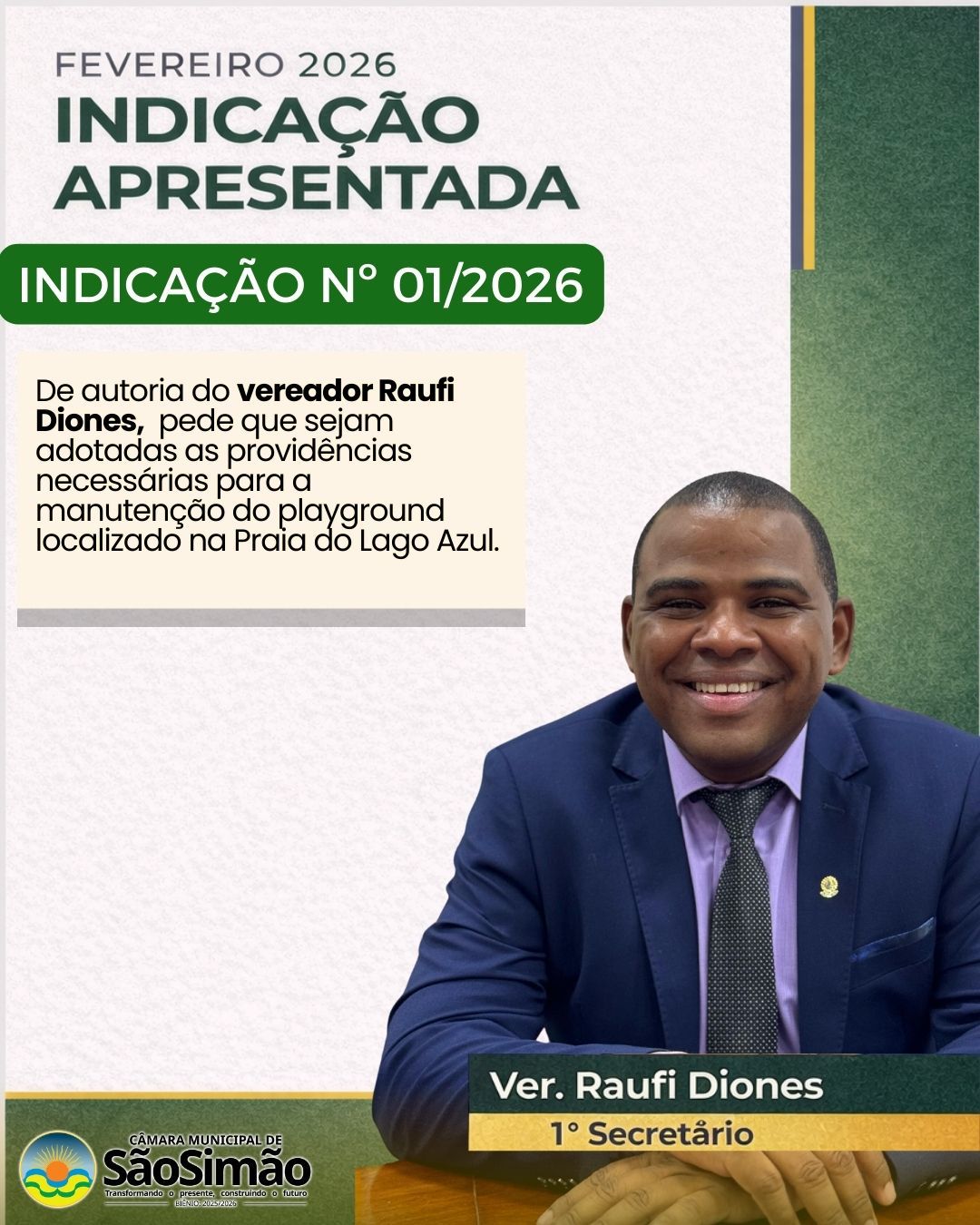 Para melhor atender as reivindicações da comunidade e ofertar melhores condições de trabalho aos feirantes, o 1º secretário da Câmara Municipal de São Simão, vereador Raufi Diones, solicitou via Indicação nº.03/2026 a realização de forramento, com vedação adequada, da Feira Coberta Jeová Dias Medeiros (Jeová das Verduras).